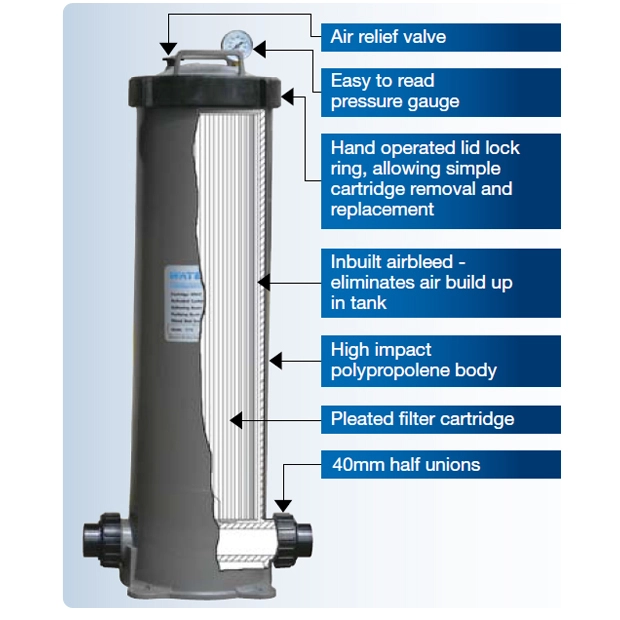 اما فیلترهای کارتریجی بهواسطه طراحی مدرن و سطح تماس گسترده کارتریجها، افت فشار بسیار کمی دارند و بهراحتی با پمپهای کمقدرت هم کار میکنند.