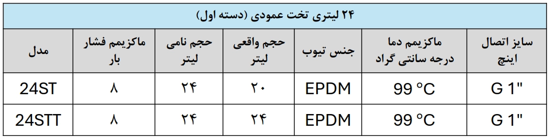 1. دسته اول: منبع انبساط عمودی تخت با حجم 24 لیتر. این مدل دارای تیوب EPDM است و دمای قابل تحمل آن تا 99 درجه سانتیگراد میباشد.