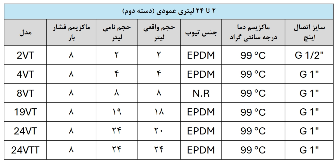2. دسته دوم: منبع انبساط عمودی با حجمهای 2 تا 24 لیتر. این مدل دارای تیوبهای EPDM و NR است و فشار قابل تحمل آن تا 8 بار است.