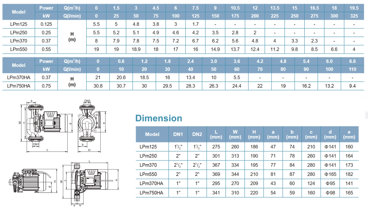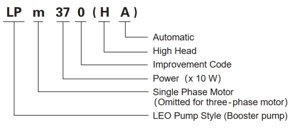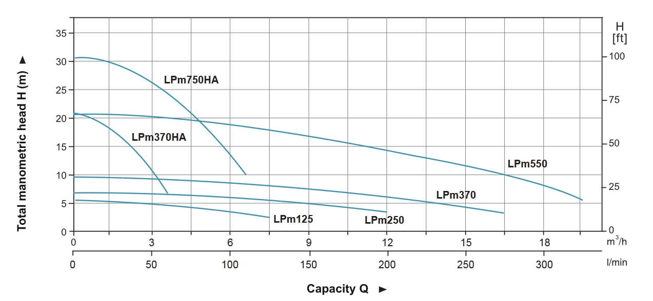 دو سری مختلف: پمپ‌های LPm در دو سری سیرکولاتور و تحت فشار طراحی و ساخته می‌شوند. مدل‌های خانگی با نماد HA مشخص می‌شوند و دارای هد بالاتر و سوئیچ قطع و وصل در خروجی پمپ هستند.
